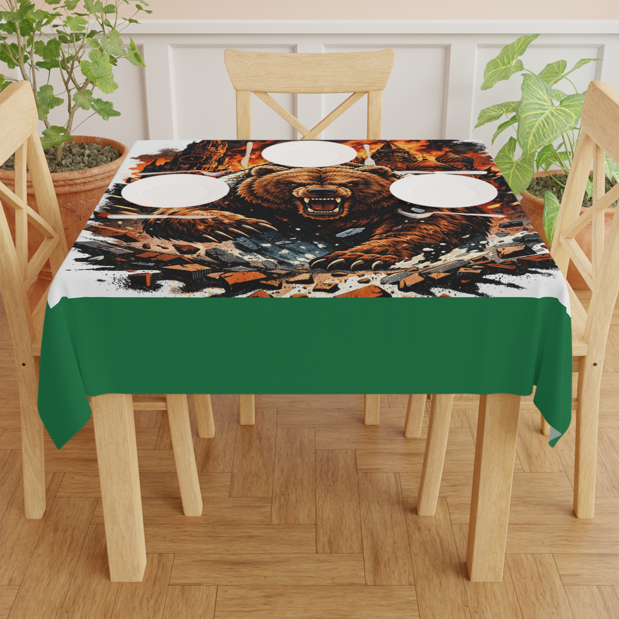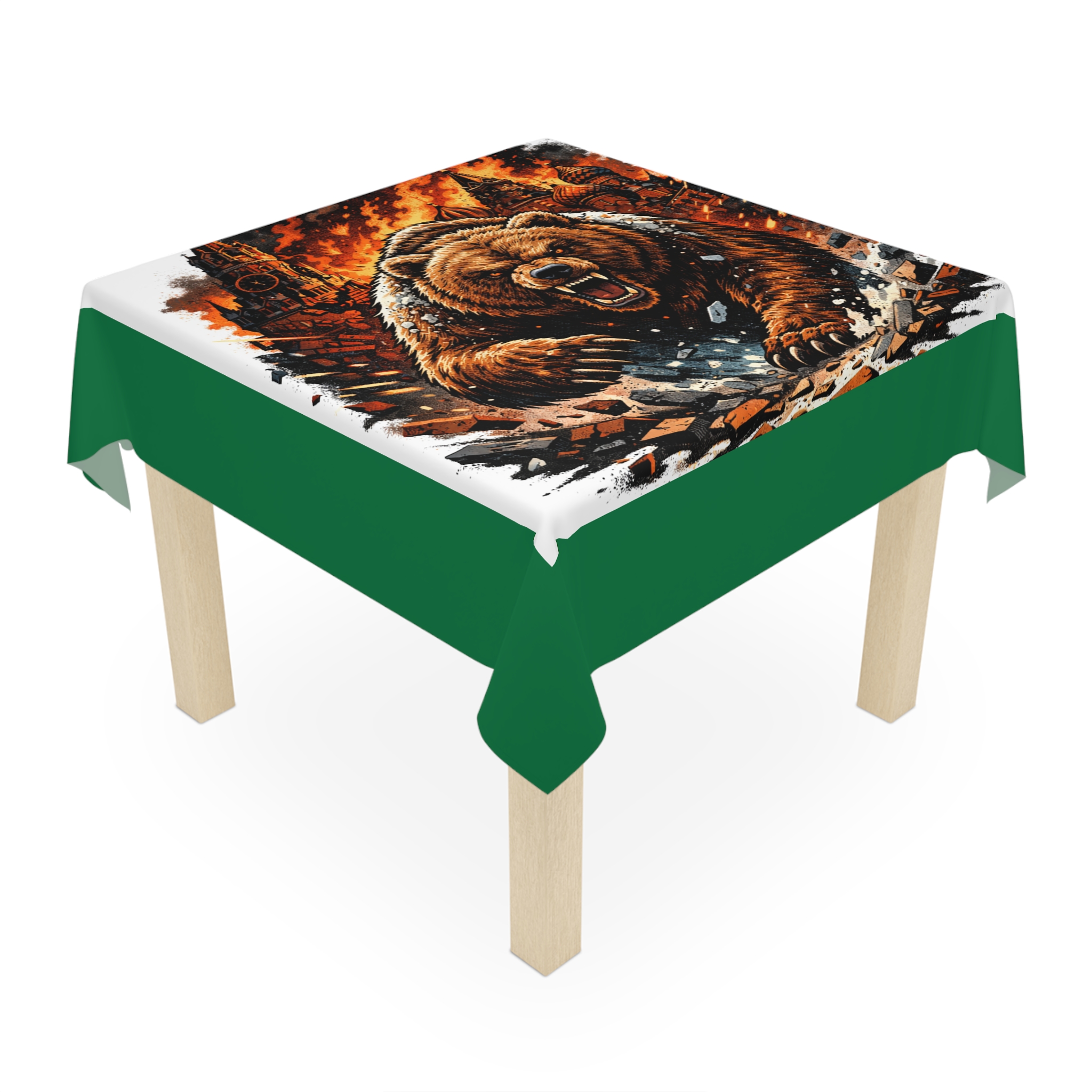 Spread a fierce, story-rich presence over your table with this vibrant square tablecloth. A roaring bear bursts forward from a backdrop of crumbling spires and blazing light — a dramatic centerpiece that turns everyday meals into something charged and memorable. The bright, detailed print sits on a soft, lightweight polyester cloth that drapes easily and feels pleasant to the touch. Use it to set a bold mood for gatherings, game nights, or themed dinners where atmosphere matters more than formality. The rich green border frames the central artwork, making the scene pop and inviting conversation every time someone pulls up a chair.